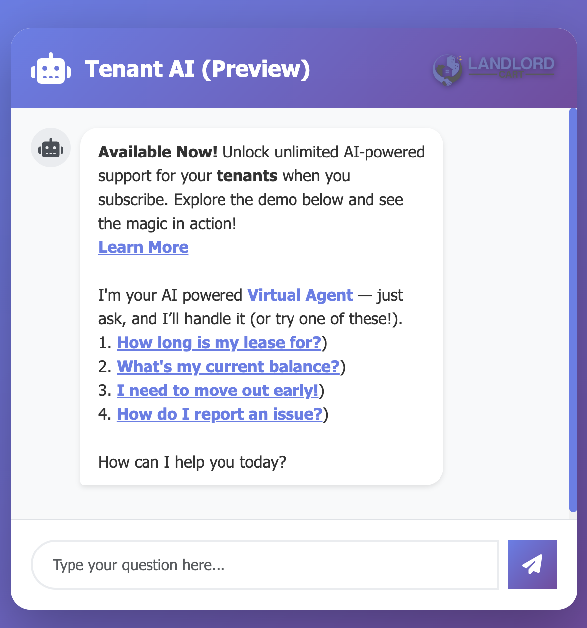 When enabled in your settings, tenants have access to a 24/7 Virtual Agent within their portal. This agent can provide immediate answers to common questions without requiring your manual response, such as: