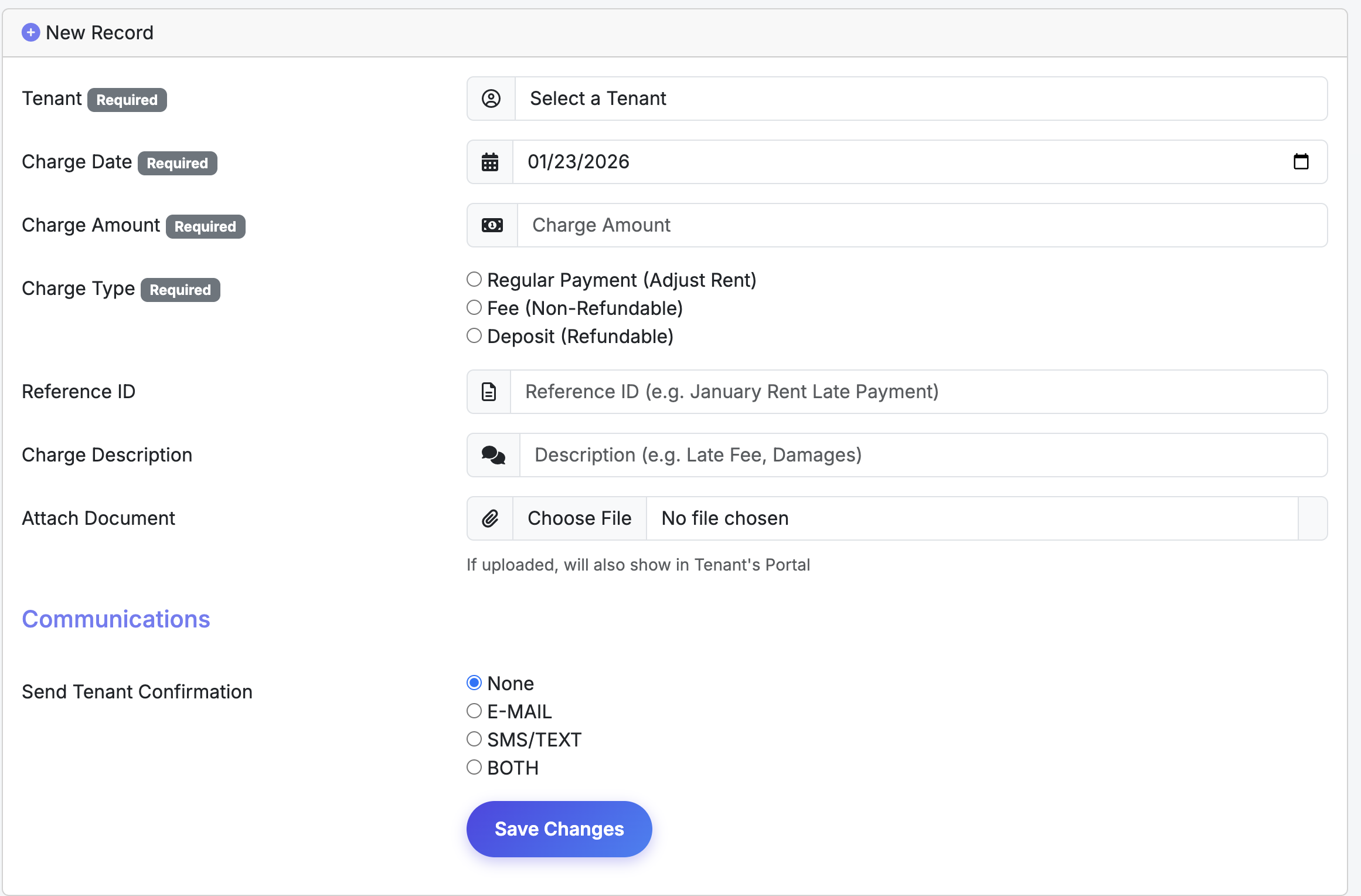 The Charges screen is designed for non-recurring fees and one-time financial adjustments. Use this section to manage transaction exceptions that fall outside of your standard monthly rent.