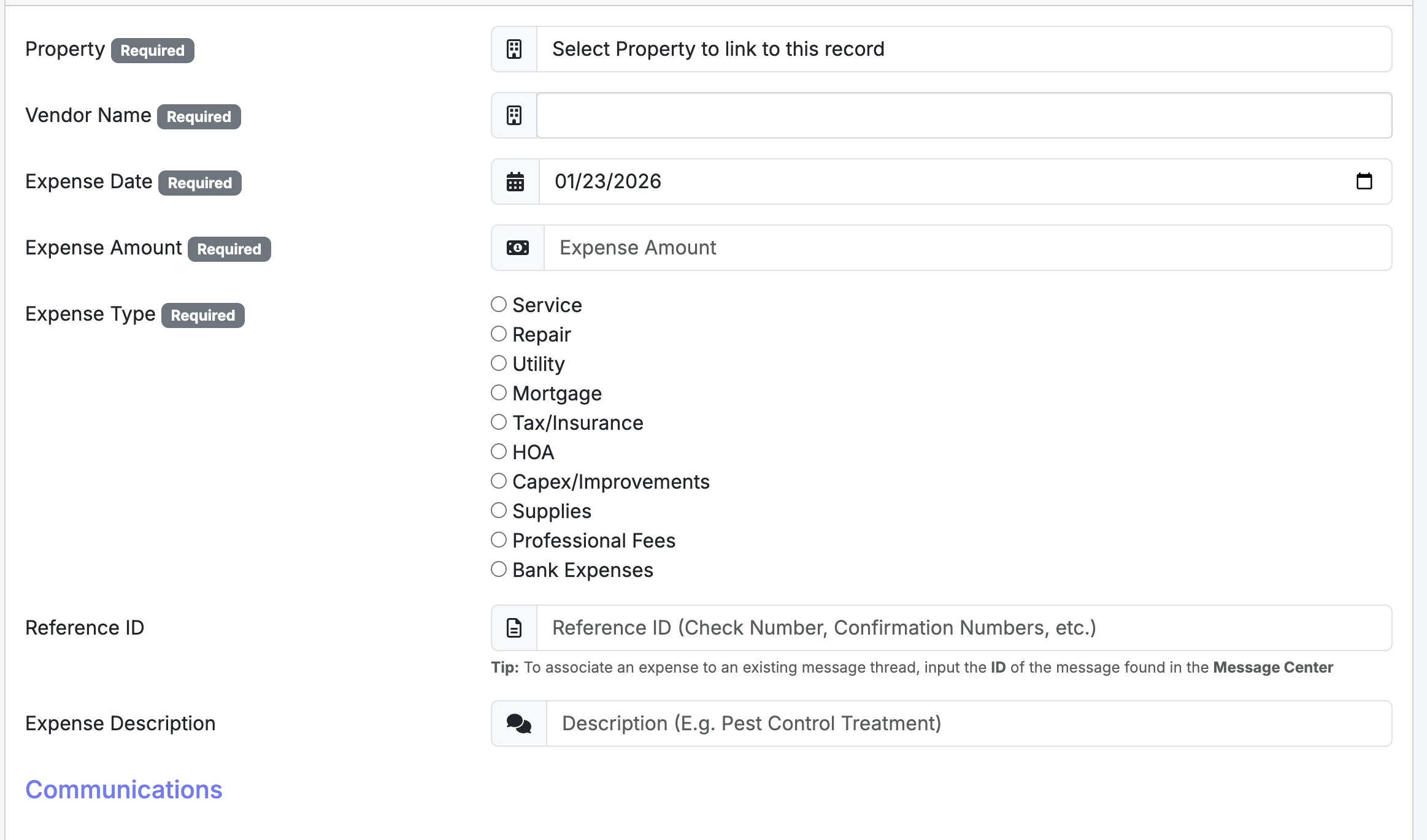 Reference ID: Use this field to track check numbers or invoice IDs. Tip: If the expense is related to a specific maintenance request, enter the Message ID from the Message Center to link them together.