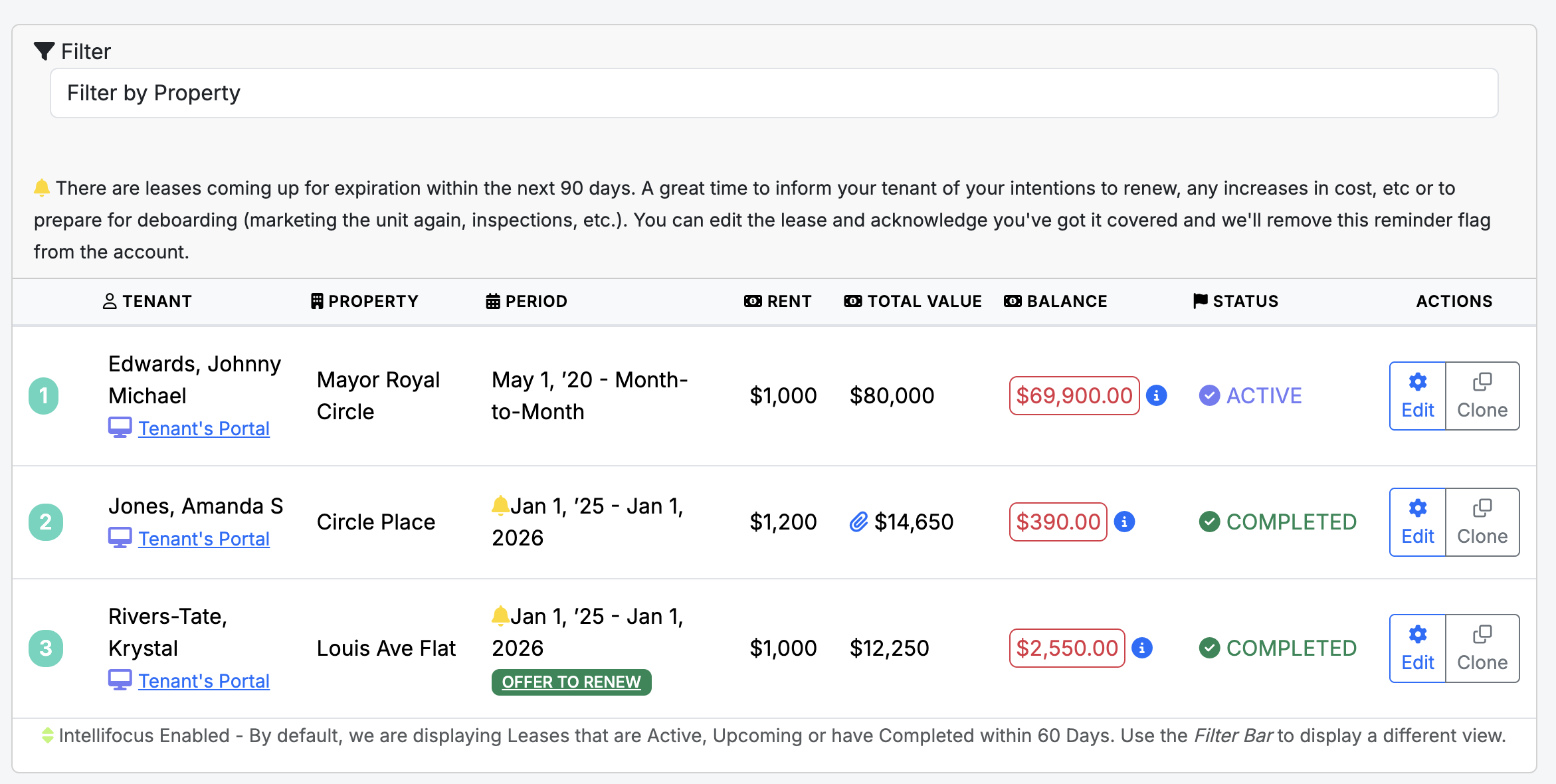 Cloning Feature: When a tenant renews, use the Clone button to copy existing details into a new lease record with ease.