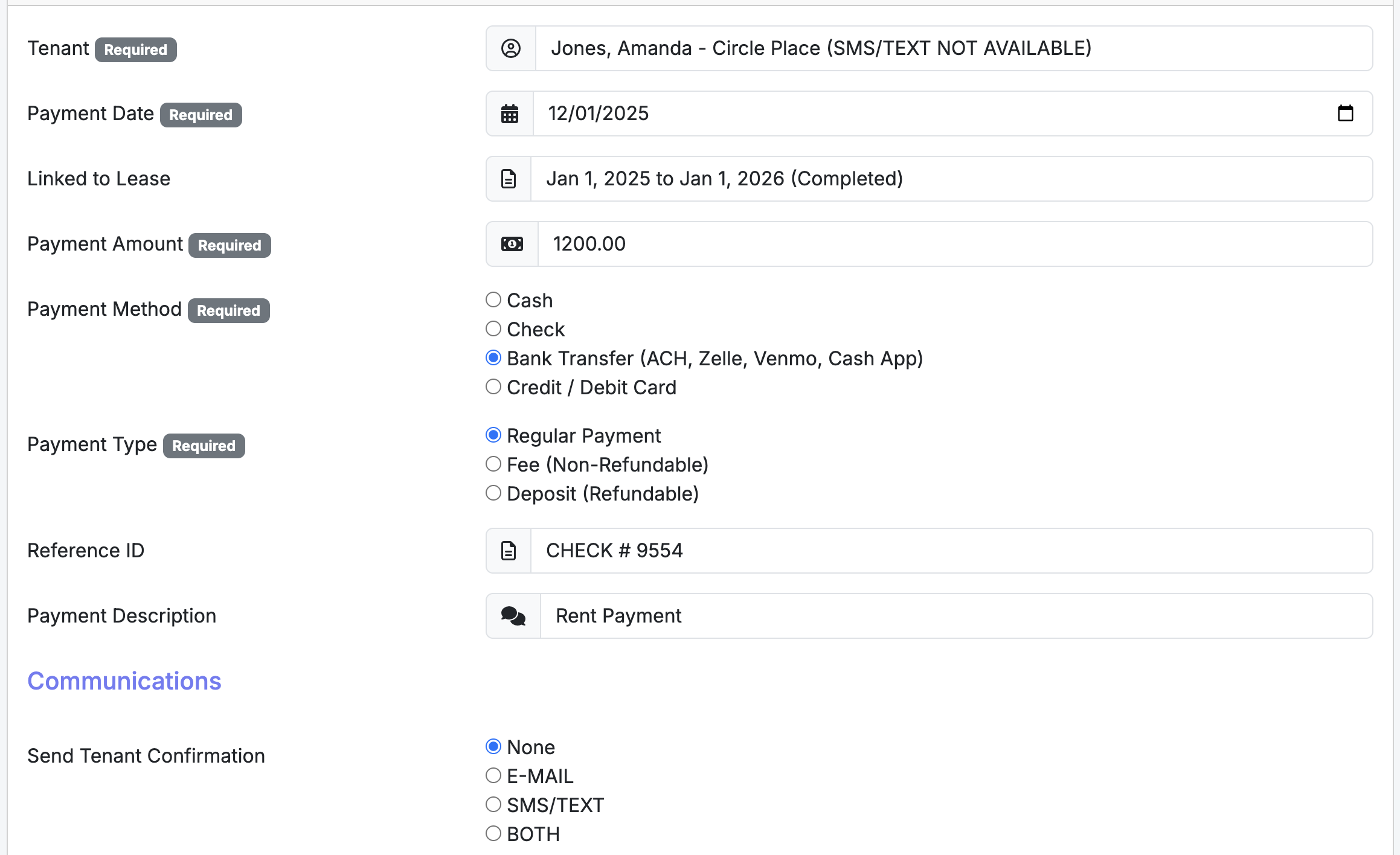Internal vs. External Notes: * Reference ID: This field is private. Use it for internal notes, check numbers, or transaction IDs that only the landlord should see.