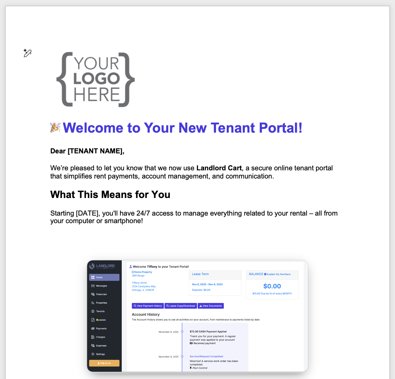 Welcome Letter Template: Download a customizable Word template to introduce your tenants to Landlord Cart. You can add your company logo to maintain a professional brand image.