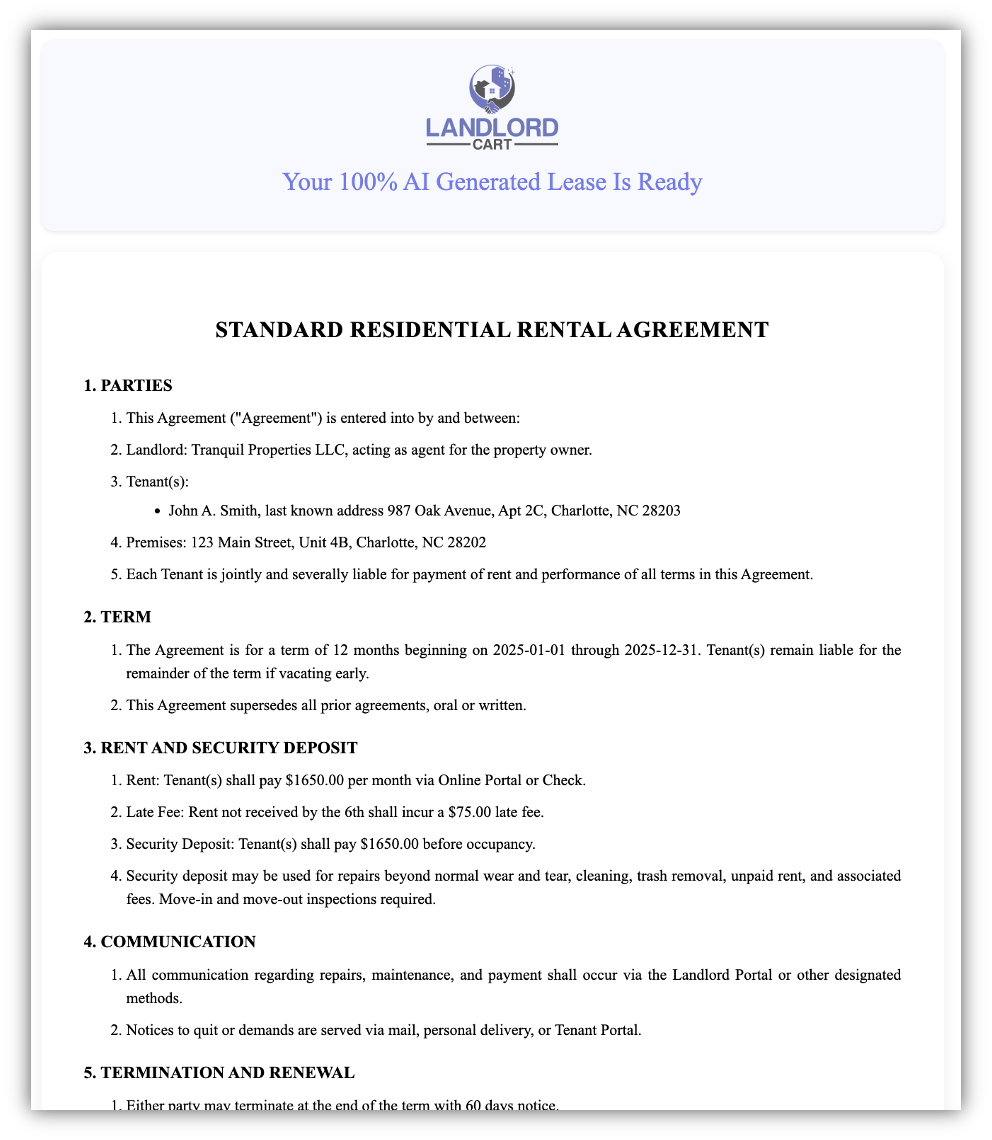 - AI Lease Generator (Free with Limits / Paid Unlimited): Our AI lease generator combines OpenAI with our proprietary template library to create precise, state-compliant leases. Free users can generate up to five leases, while paid subscribers enjoy unlimited access. This tool produces better results than generic AI alternatives.