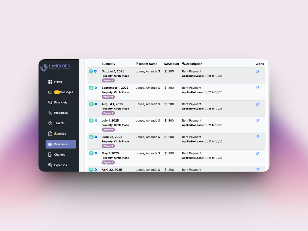 Today’s renters often pay their rent in multiple ways. We’ve seen Tenant’s pay with Zelle and CashApp one month and mail a check or Money Order the next. No matter the means, it’s important that you are able to accurately record payments from Tenants and provide them a receipt for transparency. Landlord Cart makes recording of Payments easy by filling out just a few payment details like Tenant, Date of Payment, Payment Method and the Amount.